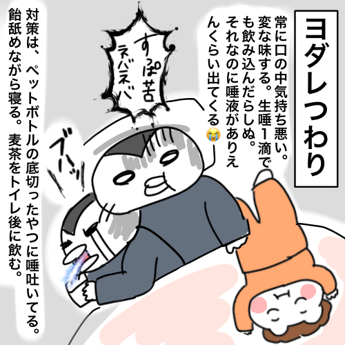 これが一番しんどかった。喉が焼けるくらい辛い😭今でも夜は唾液出ます😭