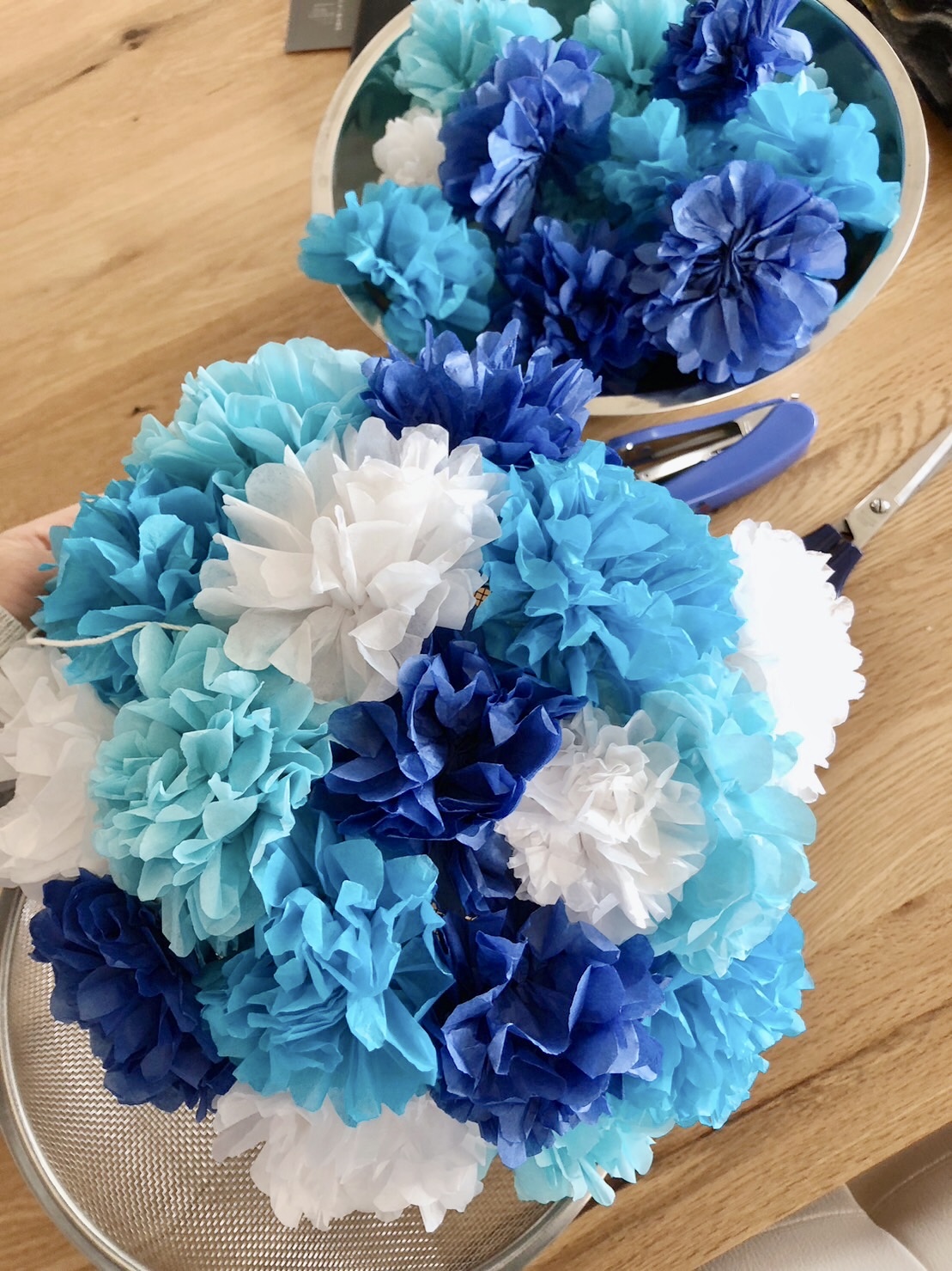 こちらはくす玉作りの過程写真です。ポンポンをたくさん作って、100均のザル2つに、グルーガンでひたすらくっつけました。