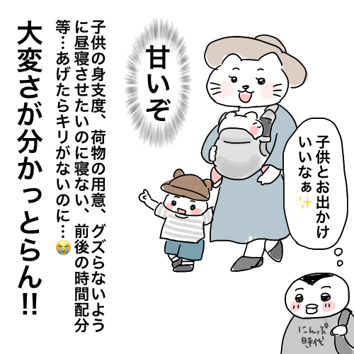 育児の大変さを知らなかった過去の自分が〇〇過ぎる話💩子育てTwitterFacebookはてブPocketLINEコピー2022.05.03こんにちは🐧今回の漫画は文章が多めで読みづらいかもしれないです🙇♂️ボツにしようかと思いましたが、せっかく書いたので「何か言ってんな。」程度で読んでもらえたら嬉しいです! 思考がクソ過ぎる💩ただの休みじゃないんやぞ!! 自分の用意もすんなりできると思ってた😇今は出かける前に疲れとる笑😂 育児はこんなに大変なんだぞ!という事を言いたいのではなく、本気で分かってなかった自分がクソ過ぎるという話です。
