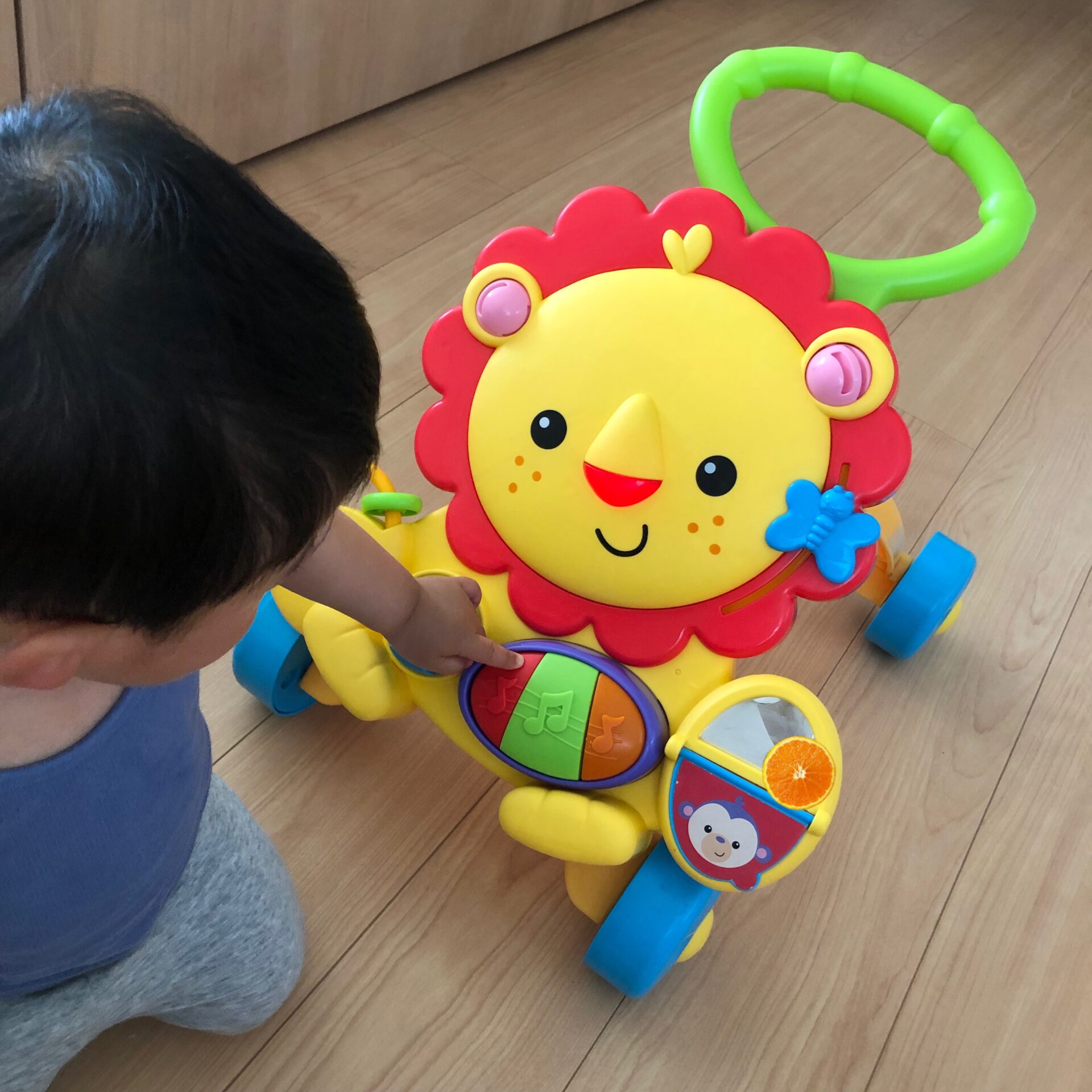 余談ですが、フィッシャープライスの手押し車をメルカリで買った✨✌️ボタン押した時と、押して歩いてる時にも音楽が流れます!やぺぶーも新しいおもちゃに嬉しそうでした🦁